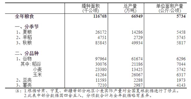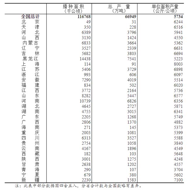全國糧食總產(chǎn)量為31個(gè)省(區(qū)、市)夏糧、早稻和秋糧產(chǎn)量的總和。